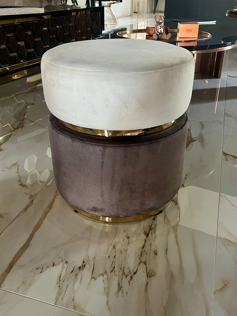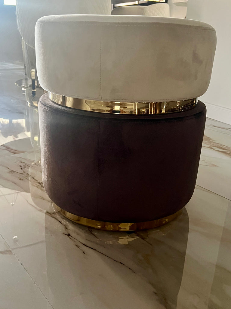 • Clean, two-tone upholstery and a gold metal decorative ring at the bottom.