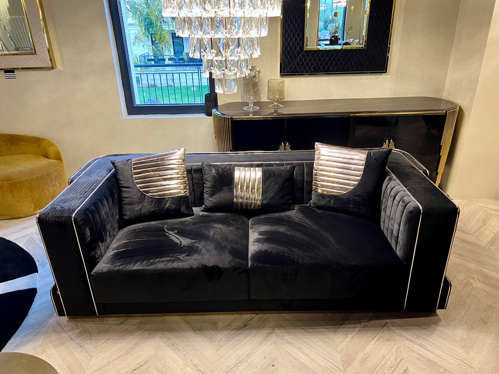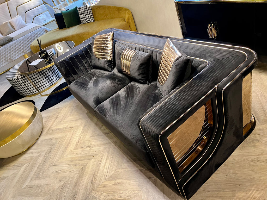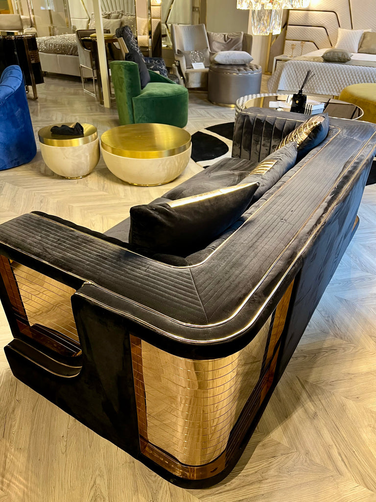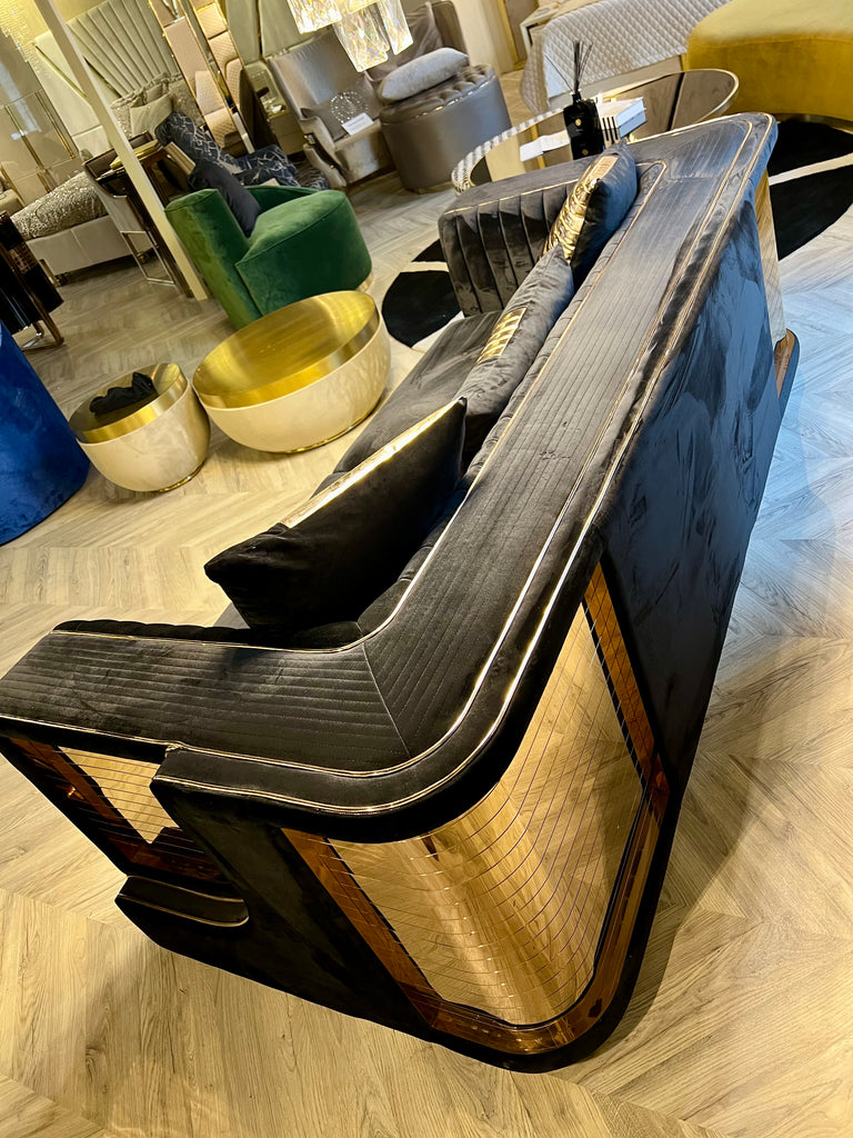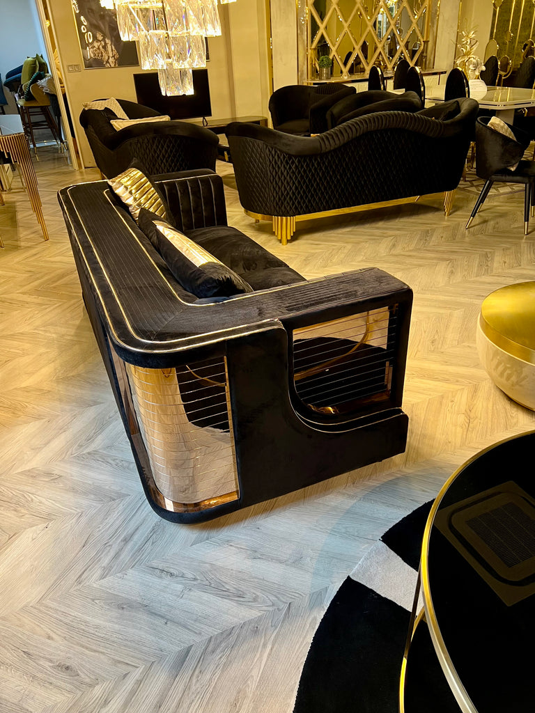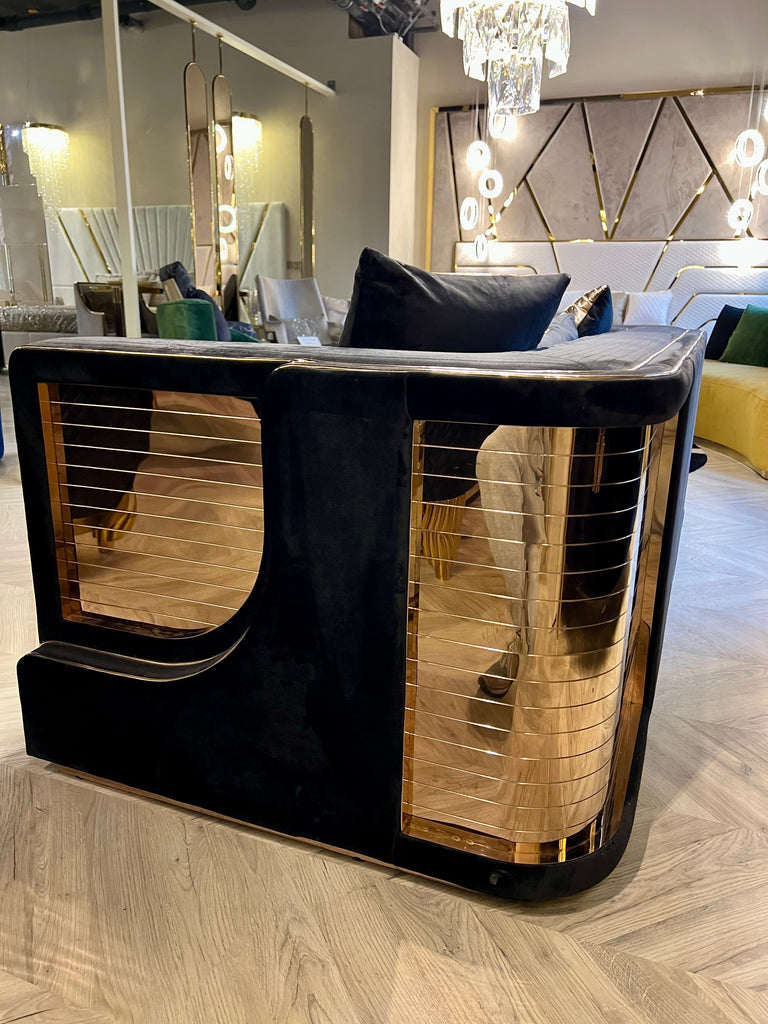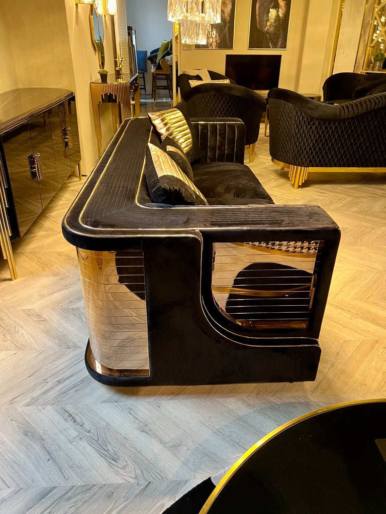 2-person sofa with black velvet and rose gold metal insert available from a set. The product can be viewed in our showroom.