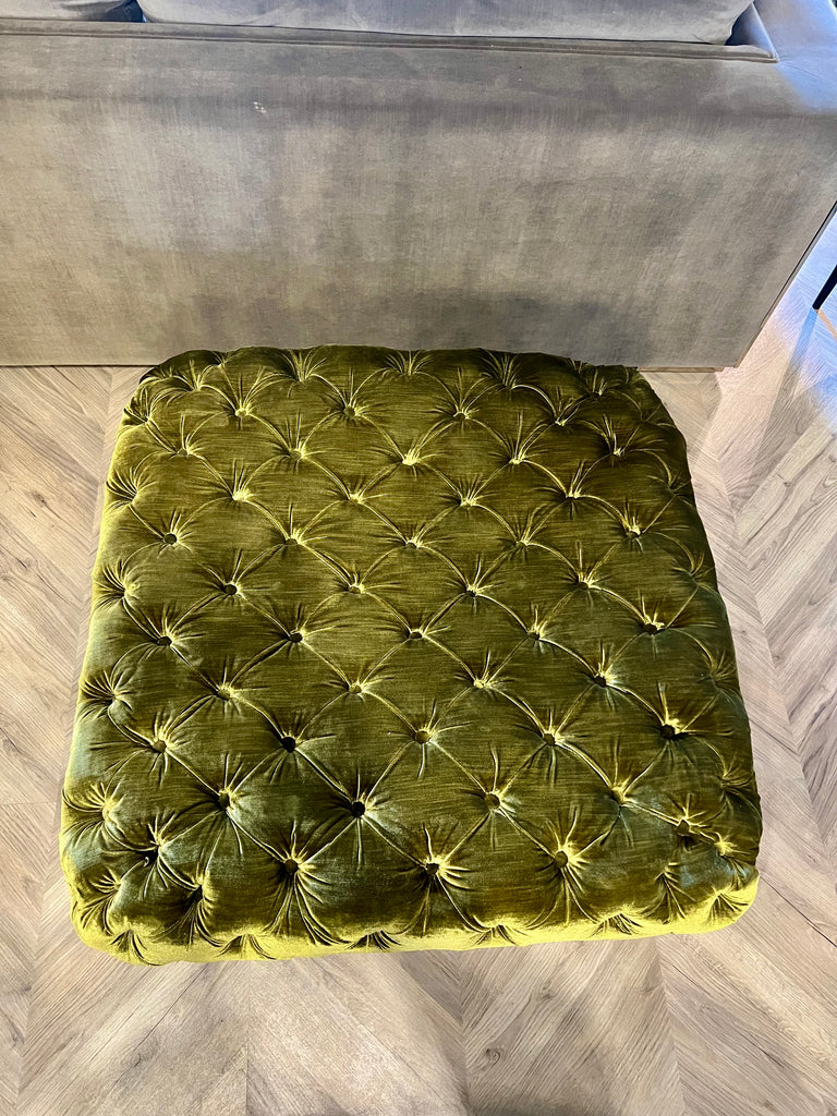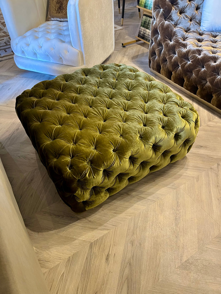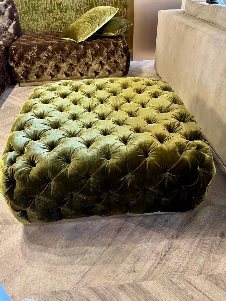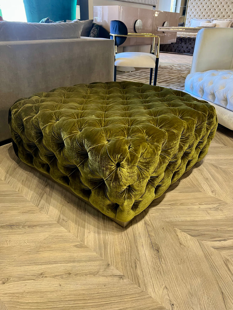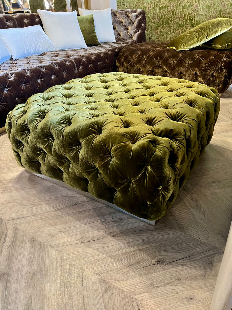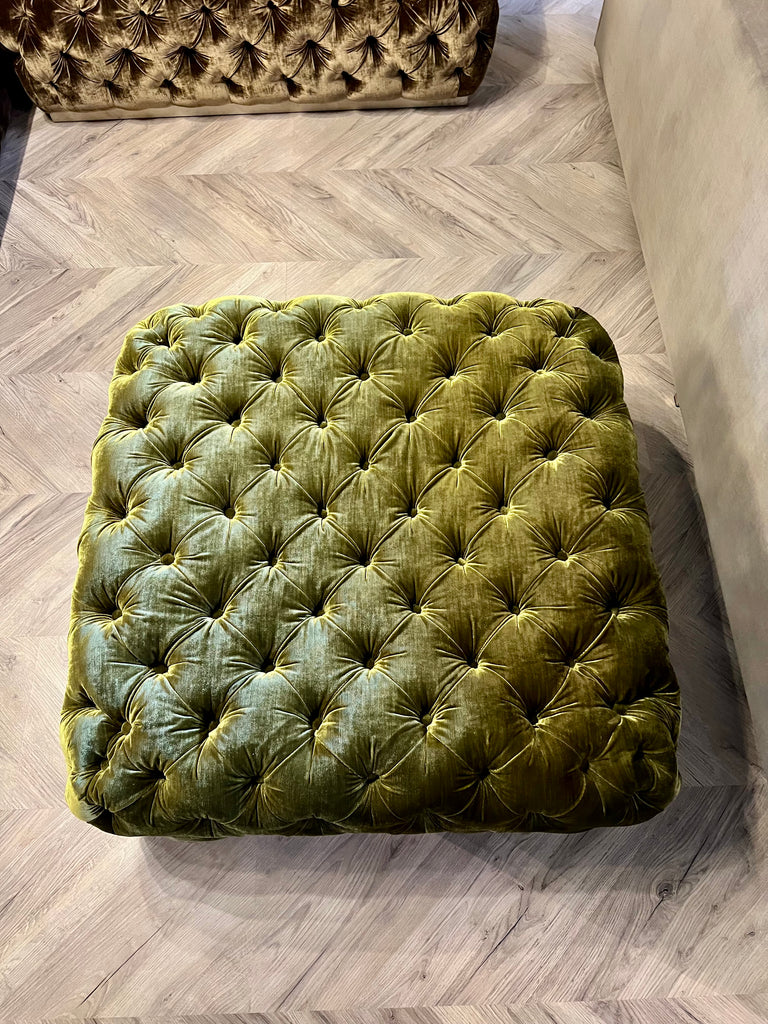 Hecuba pouf can be taken from the set in bright green, with steel legs galvanized in matt gold at the bottom. The product can also be viewed in our showroom.