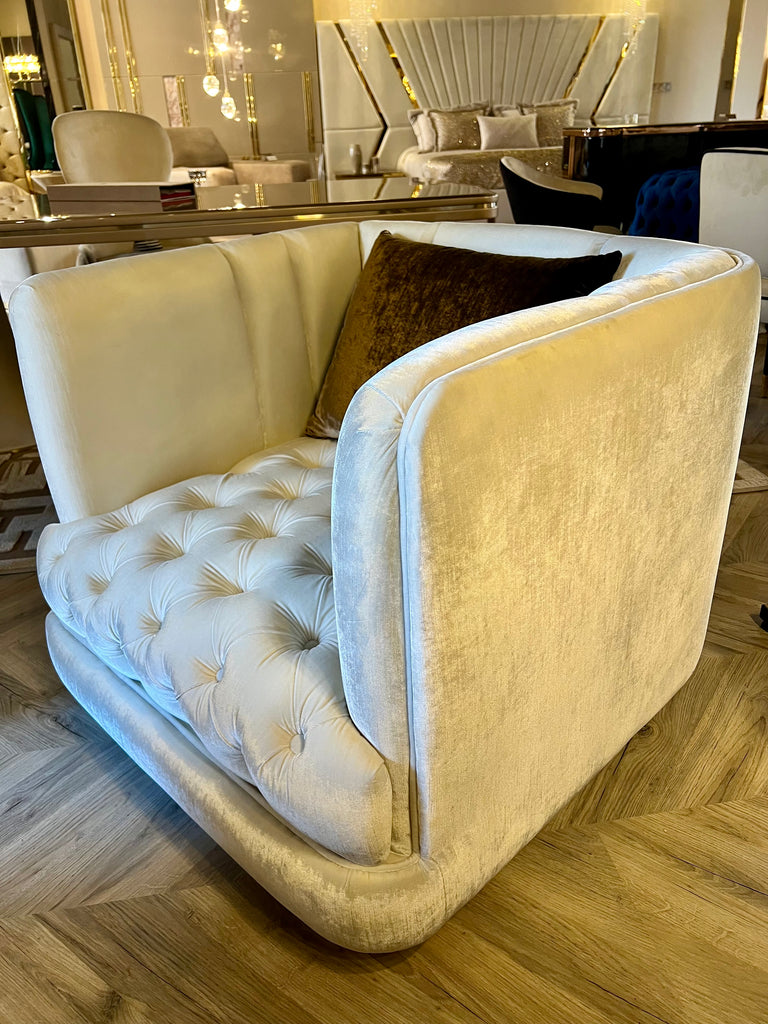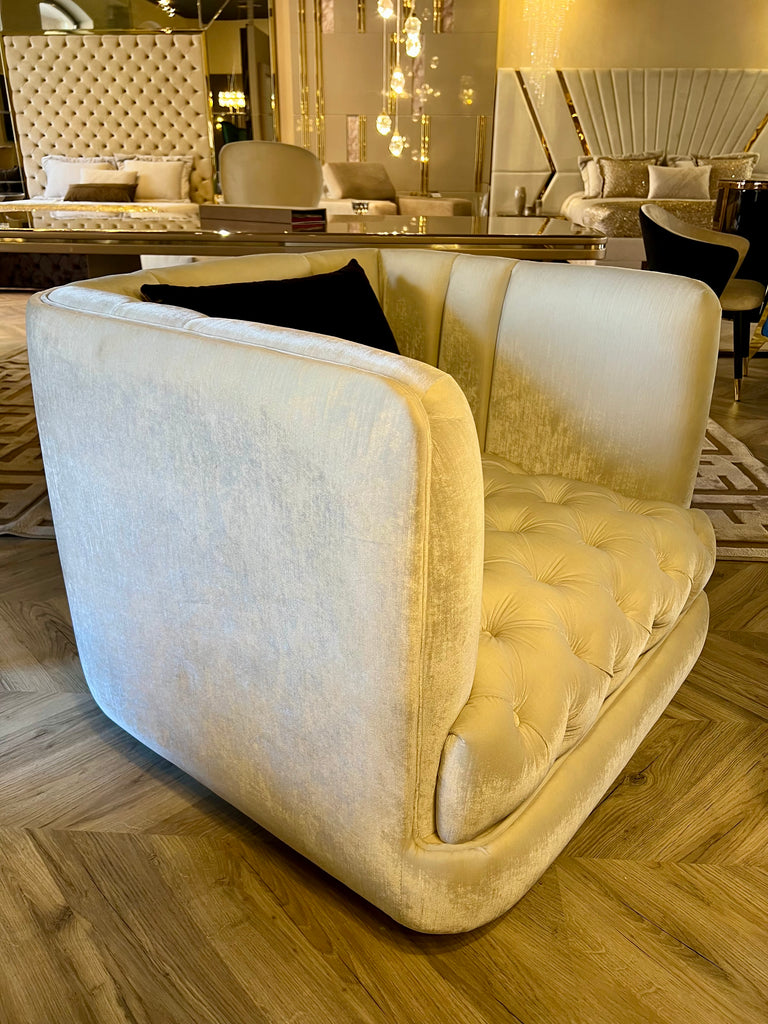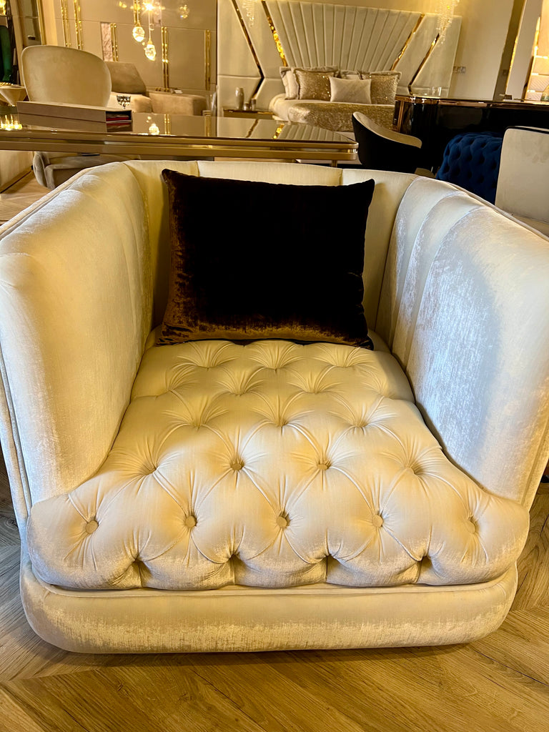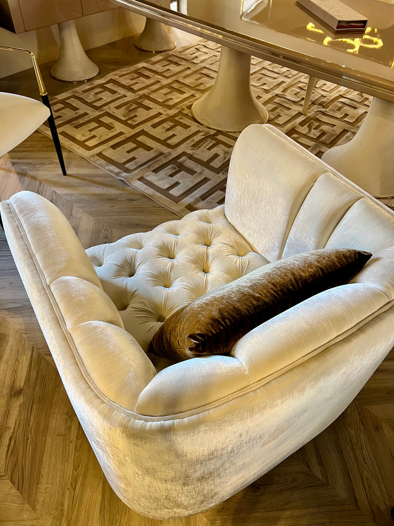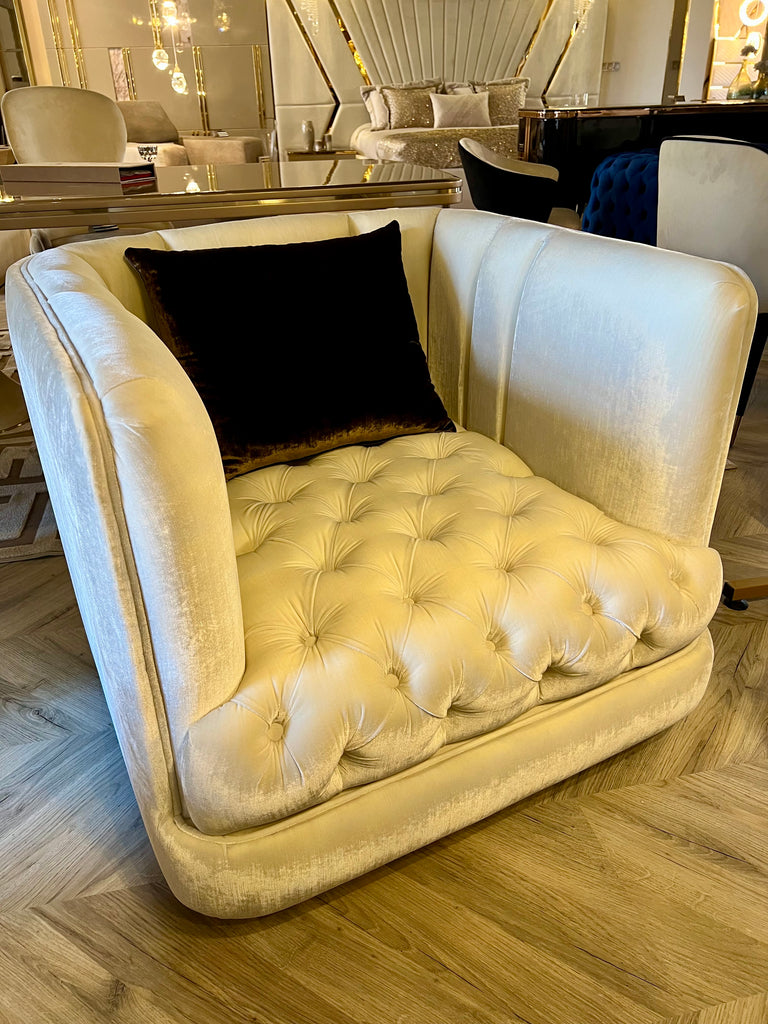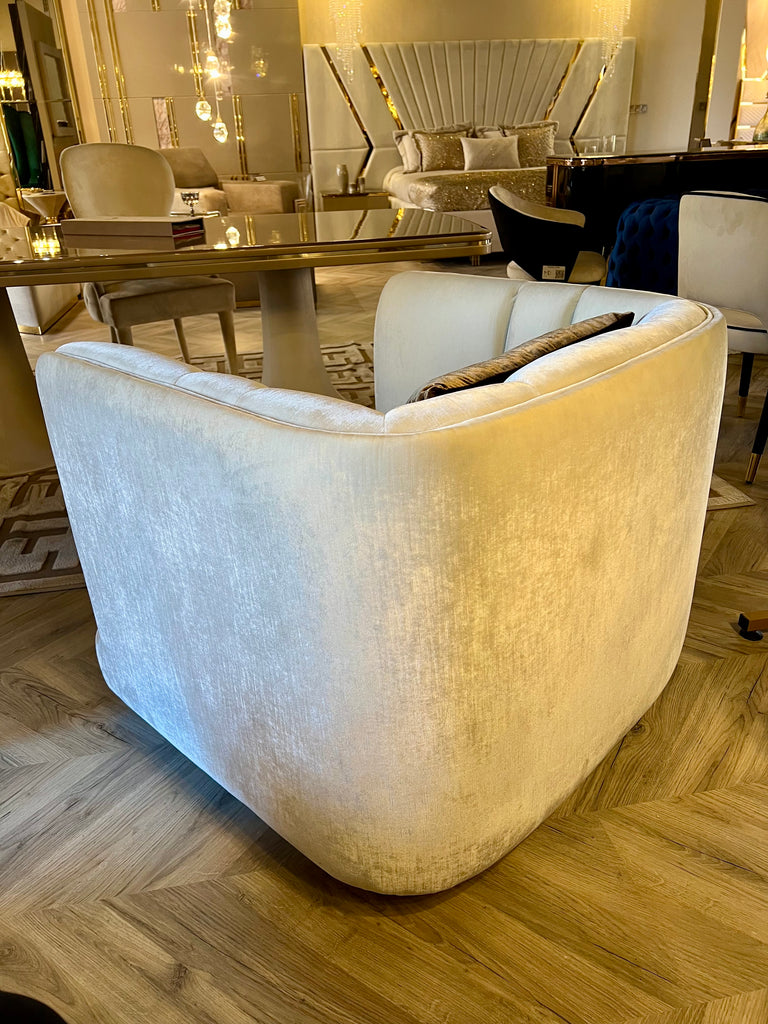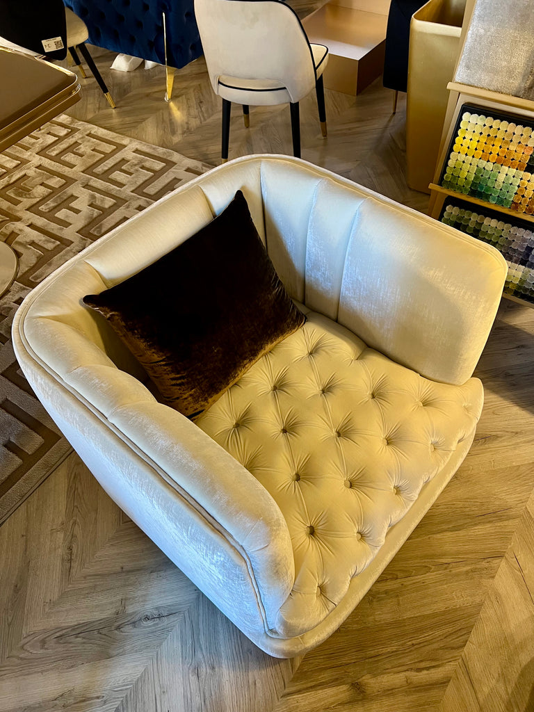 Hecuba swivel armchair can be taken away from the set in white glossy velvet fabric and gold metal legs. The product can also be viewed in our showroom. The pillow is included with the product.