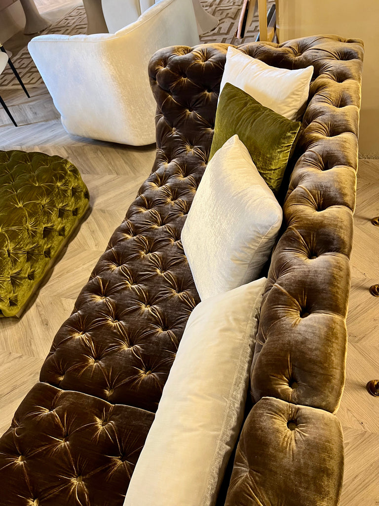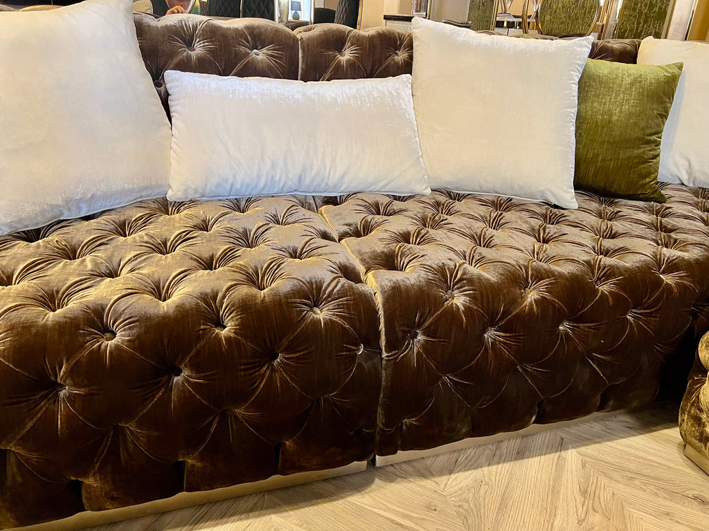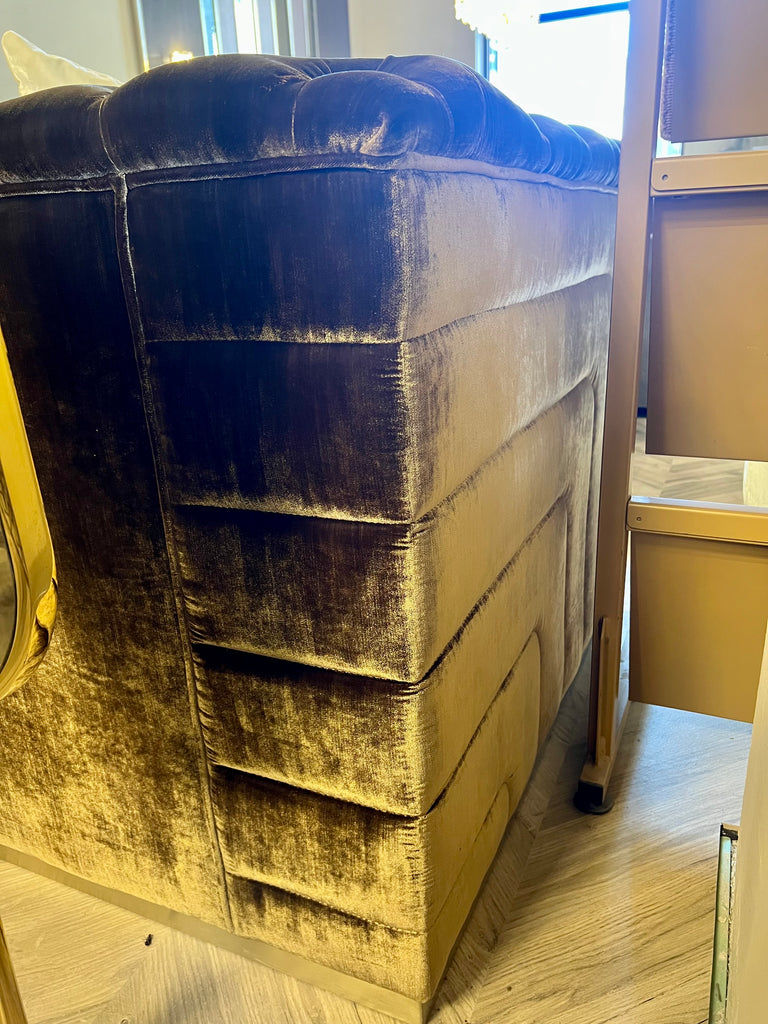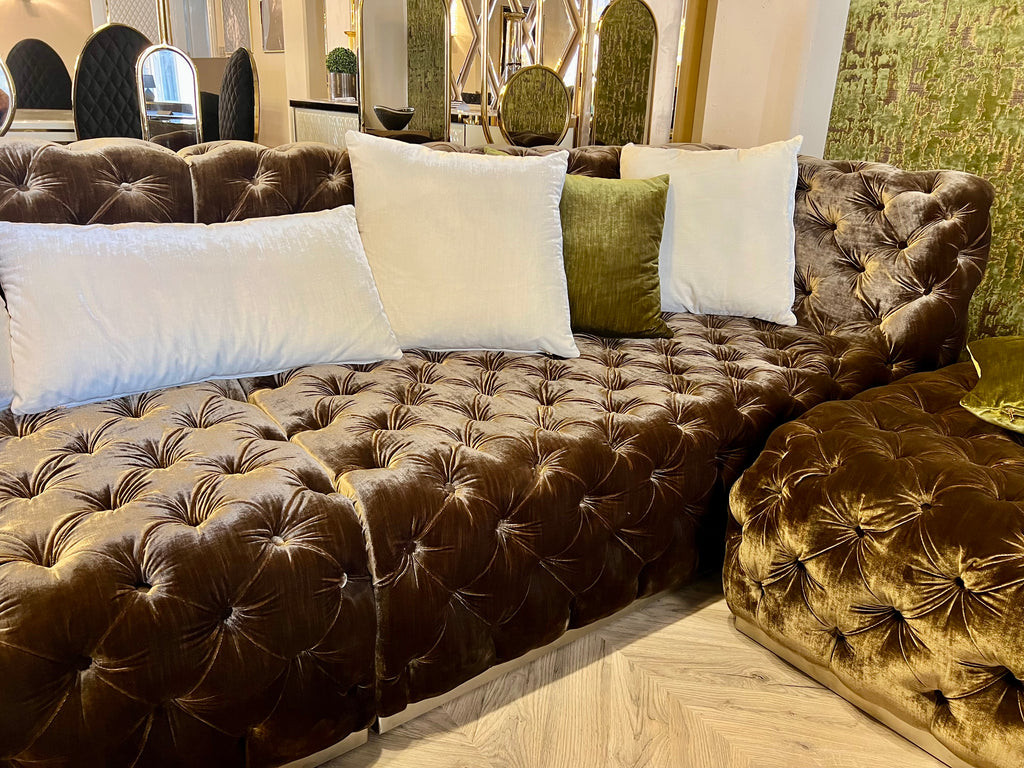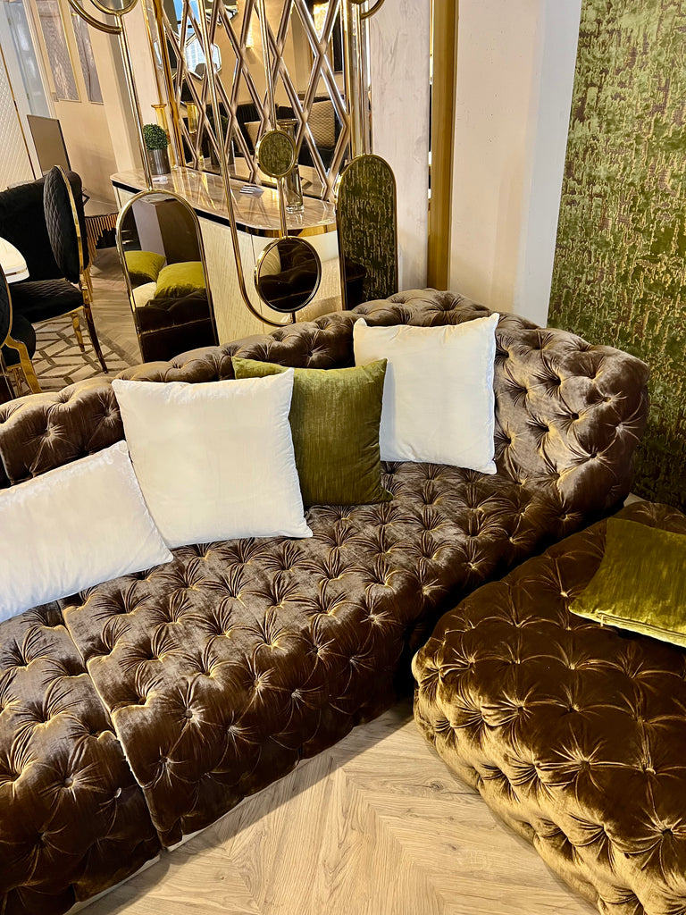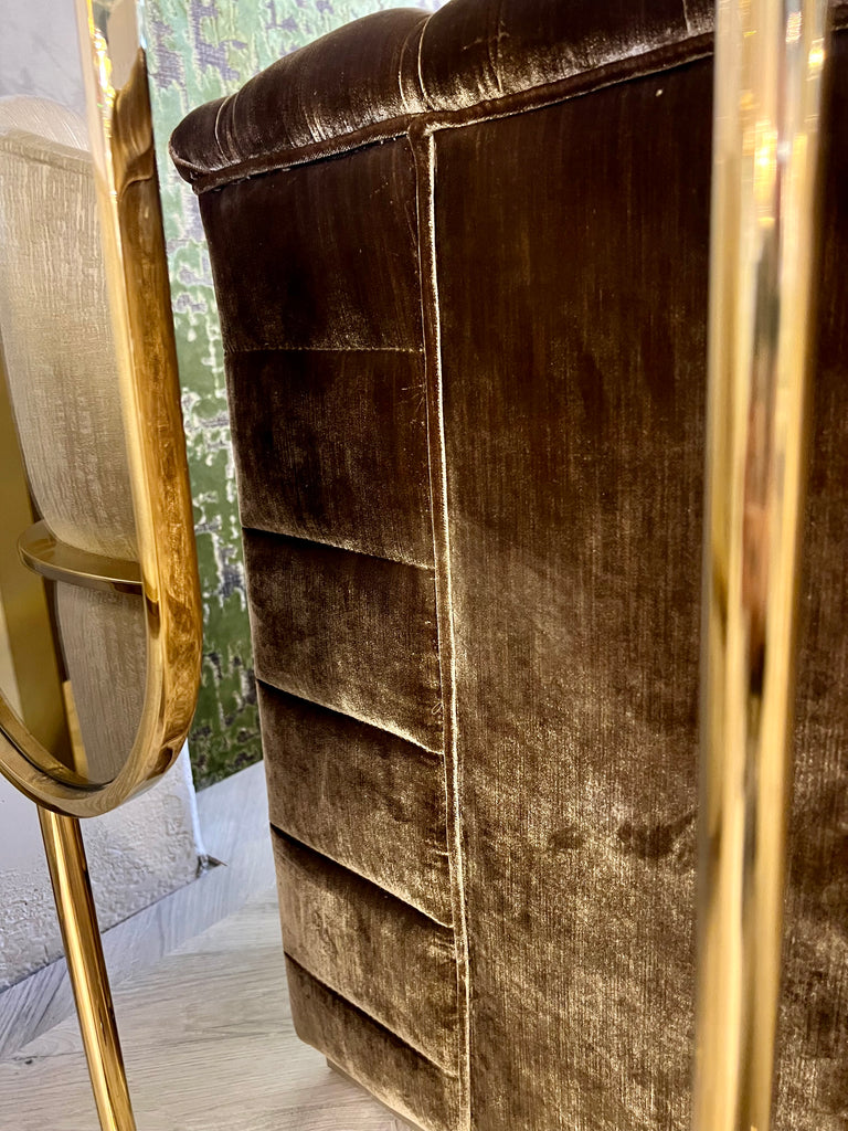 3-seater velvet sofa in glossy brown fabric-matte gold metal legs. The product can also be viewed in our showroom. The sofa is L-shaped, with an attached pouffe in the same color.