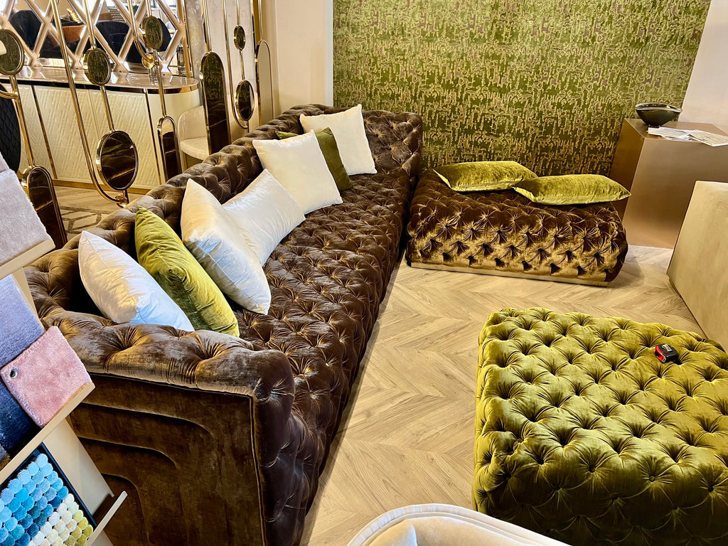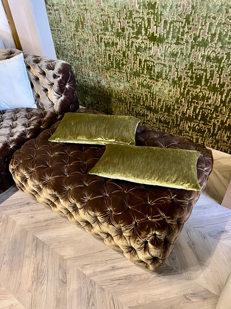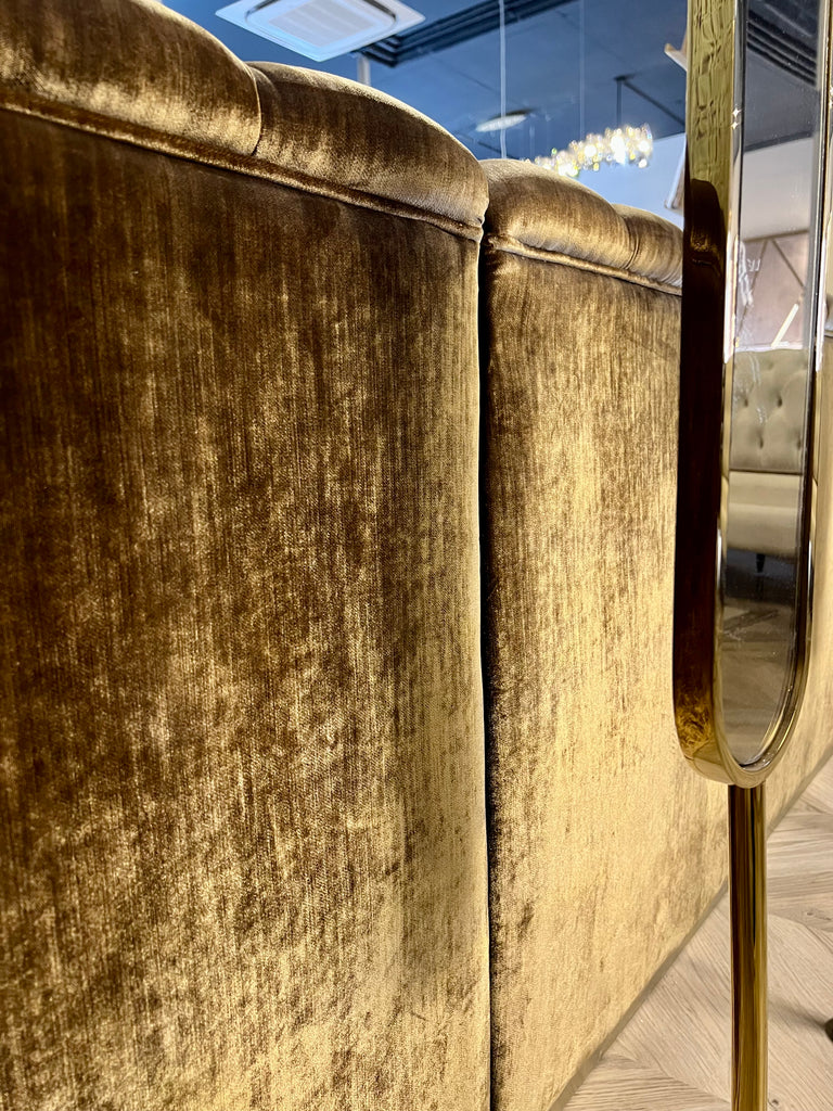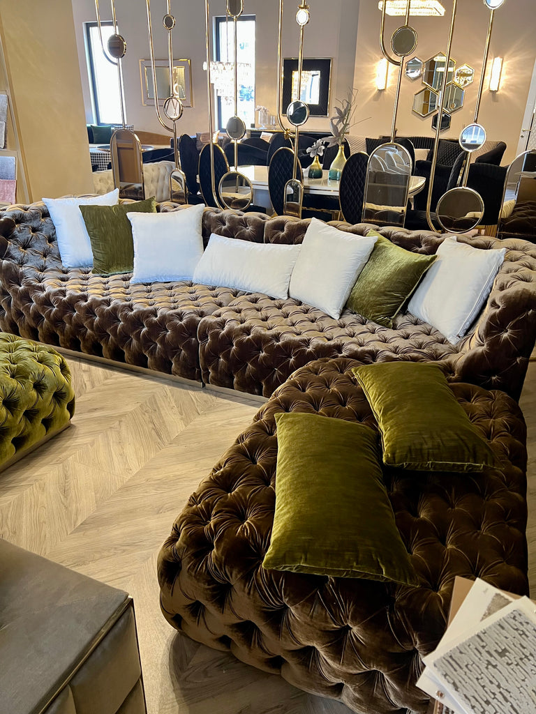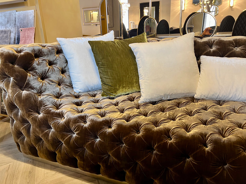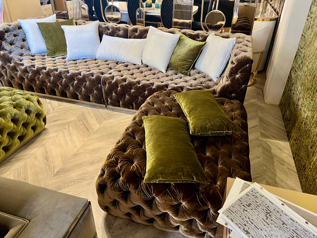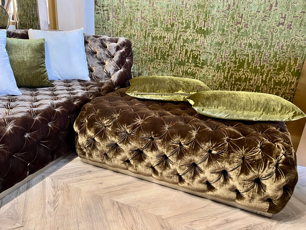 3-seater velvet sofa in glossy brown fabric-matte gold metal legs. The product can also be viewed in our showroom. The sofa is L-shaped, with an attached pouffe in the same color.